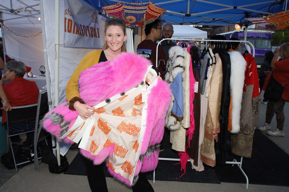 Fiona Cyzmer shows off wearable art by studio [DIALECTICA] at Newmarket's first-ever Night Market event at the Riverwalk Commons