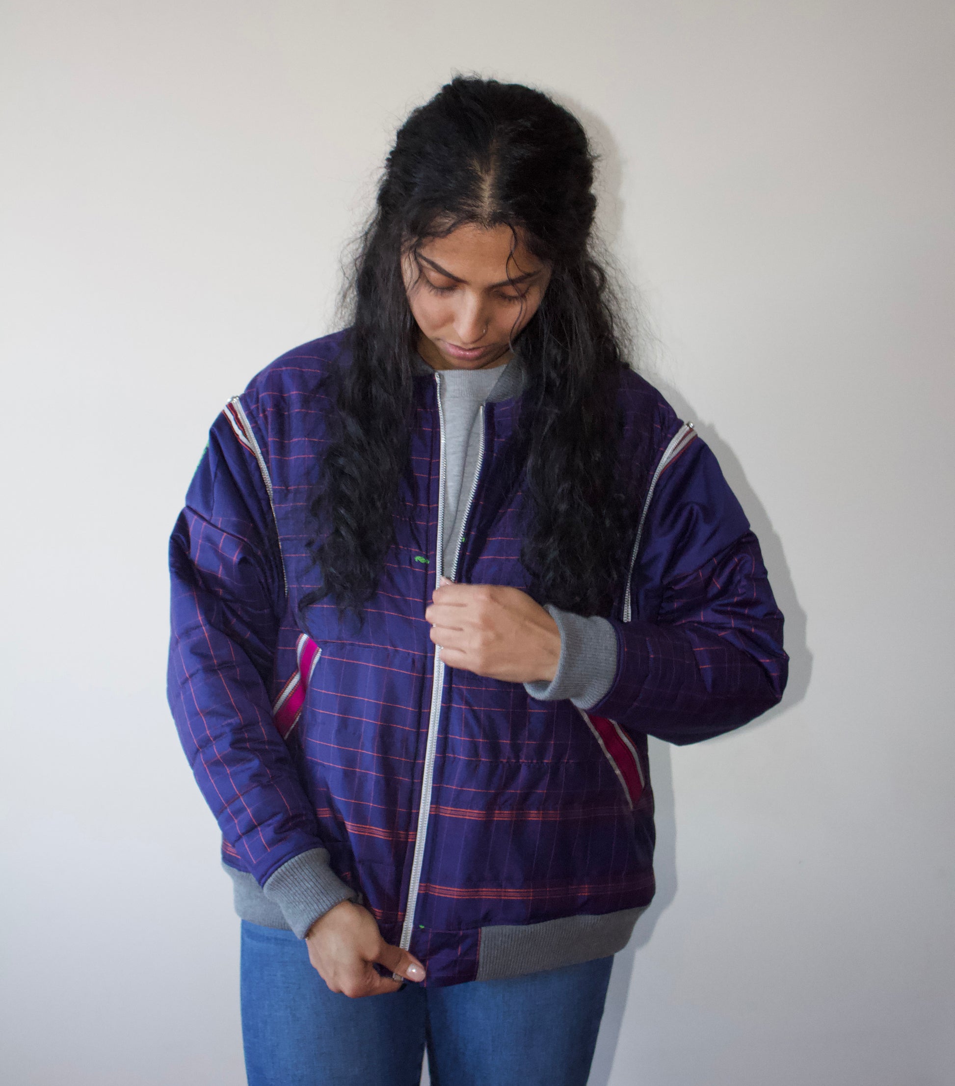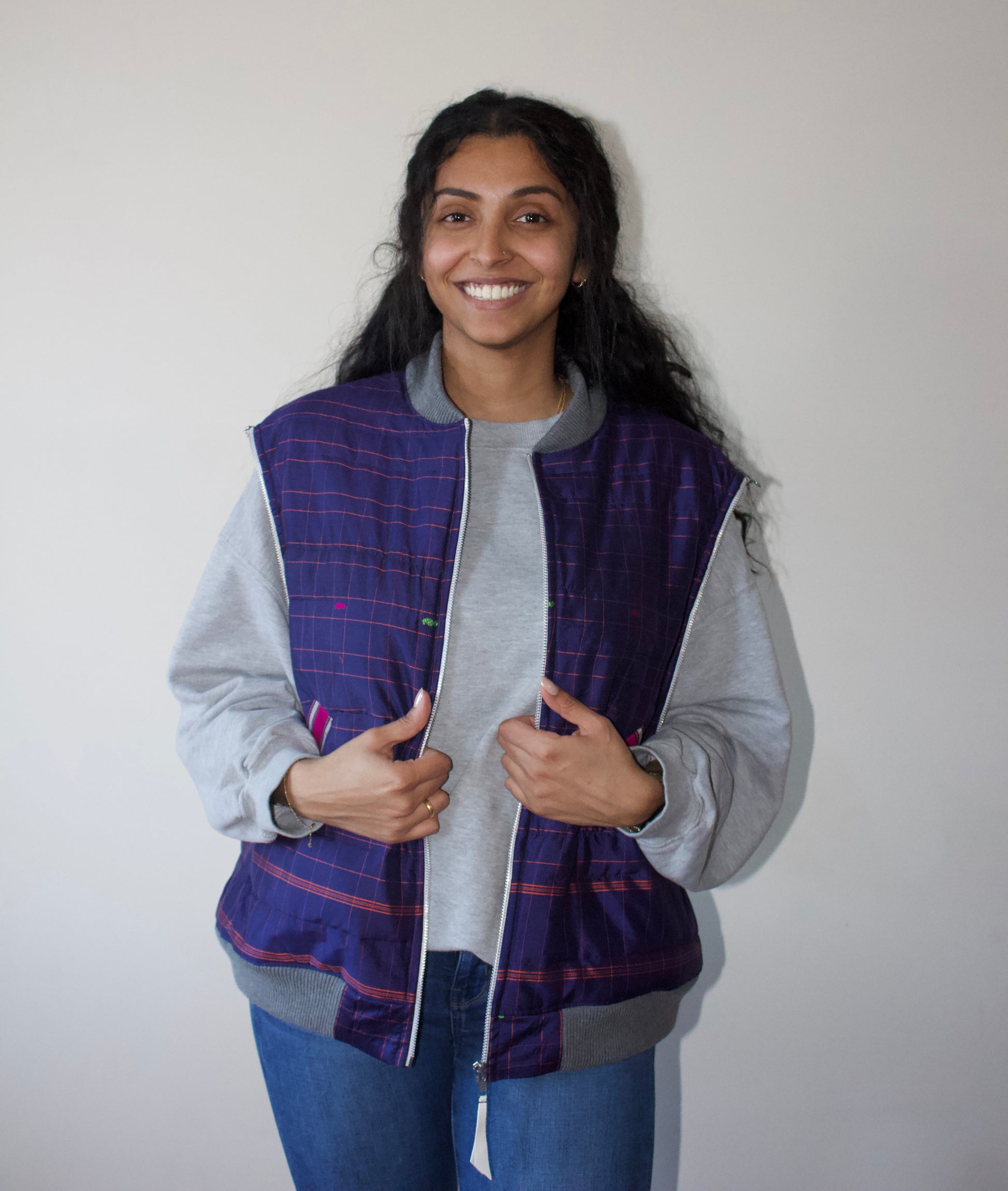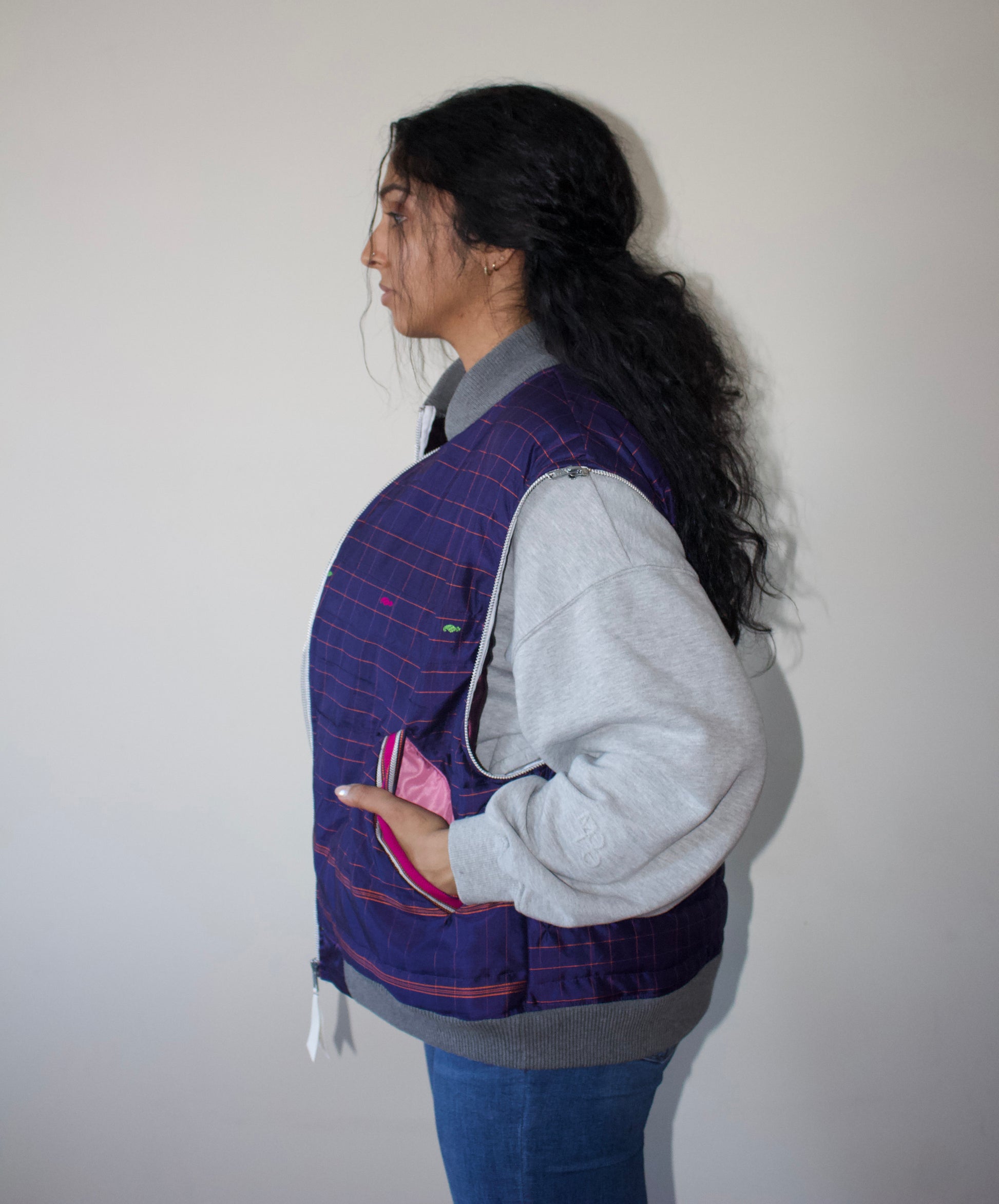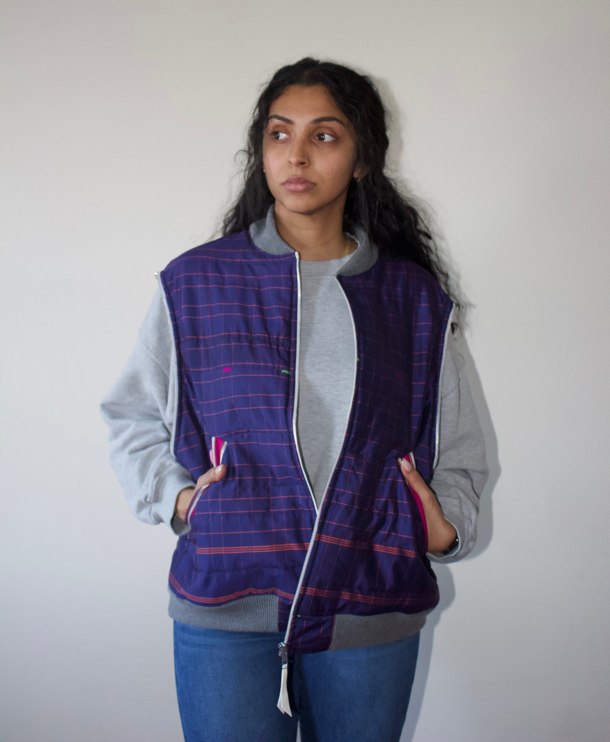 We believe that sarees are too stunning to not wear everyday, so we turned this one into a jacket! Introducing: the 100% silk, practical ultra-utilitarian modular graduate jacket which can transform into a vest. The collar, hem, and sleeve cuffs are also created from an upcycled sweater. This is a piece we want to wear for 3 seasons out of the year as a jacket and vest - no need to buy 2 different garments.