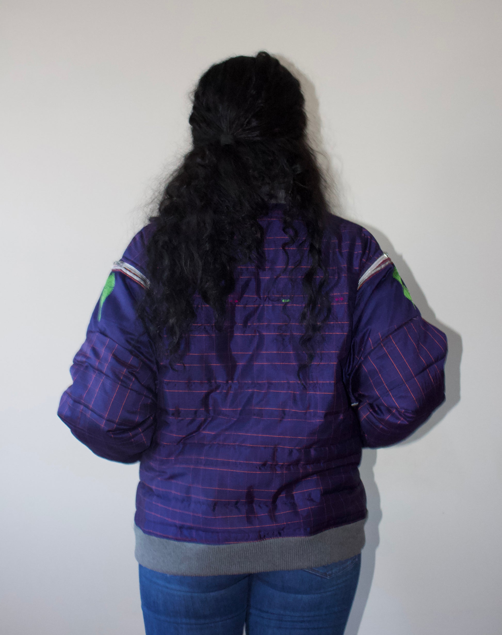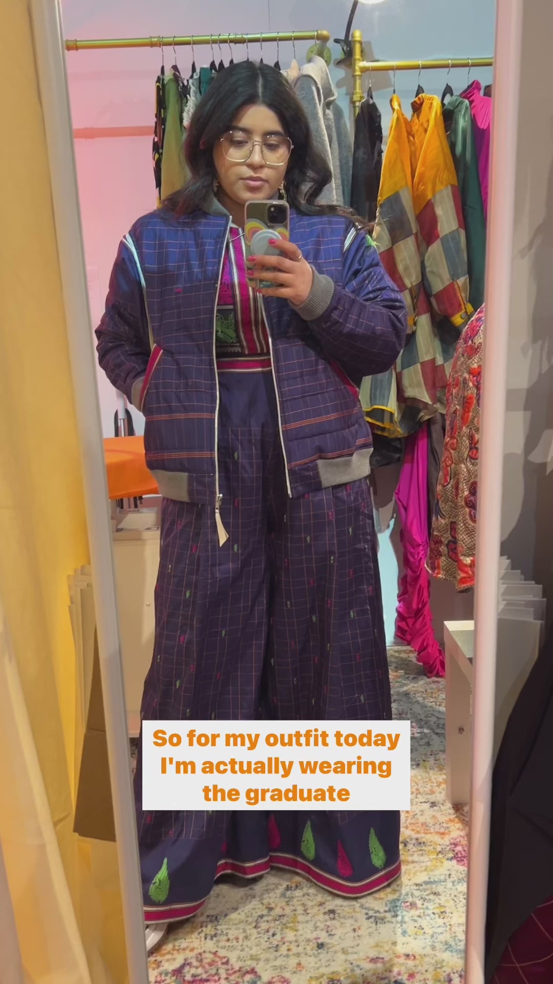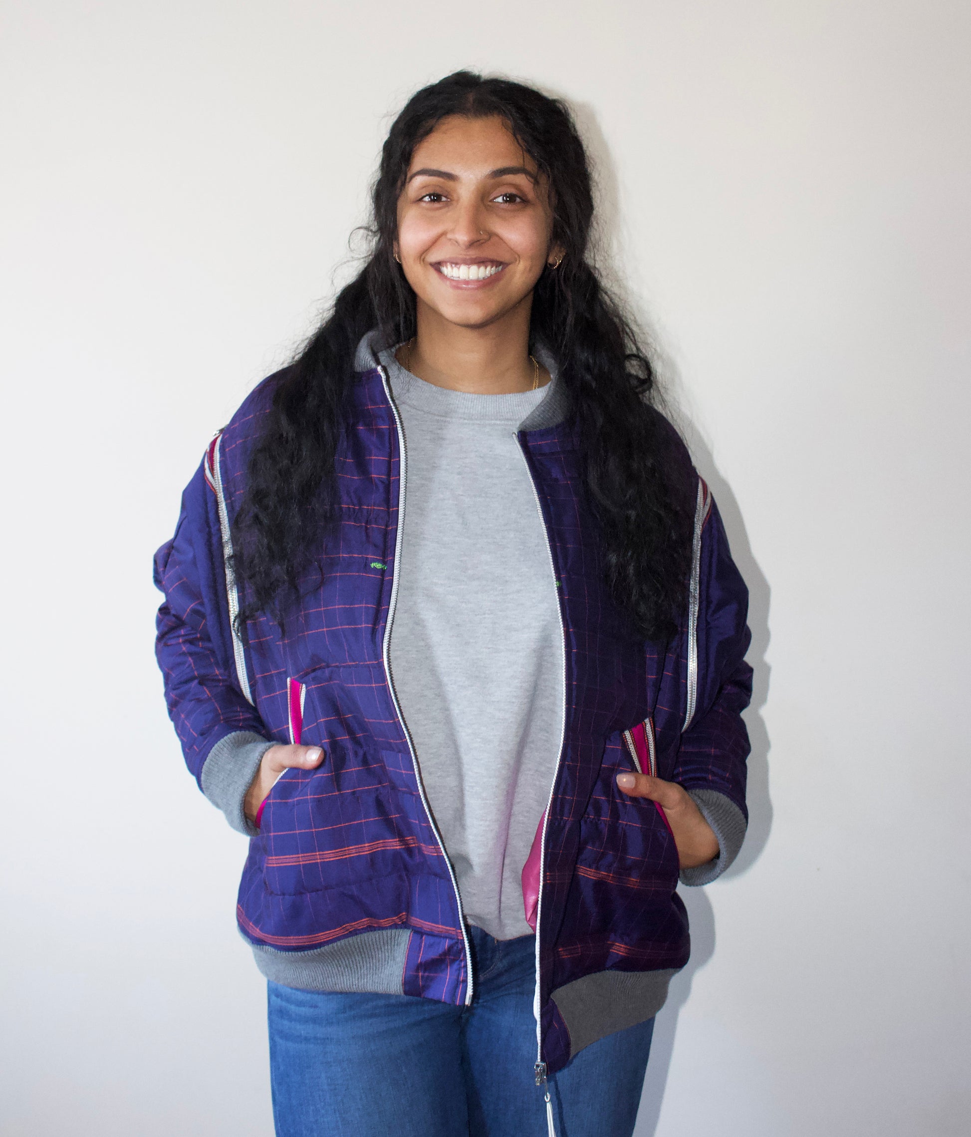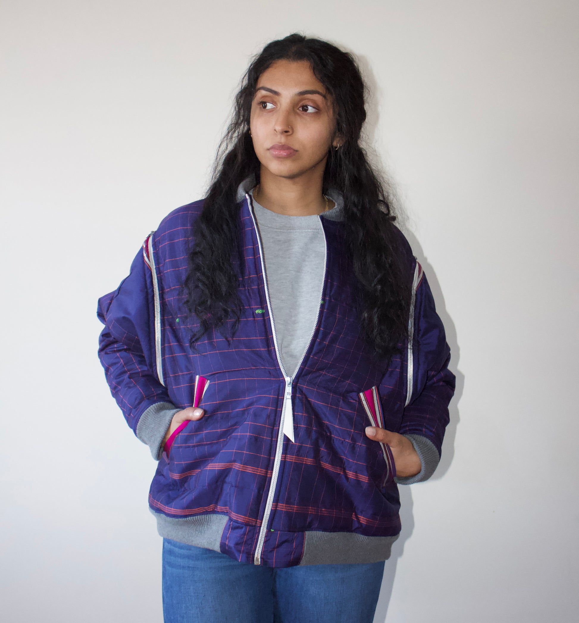 We believe that sarees are too stunning to not wear everyday, so we turned this one into a jacket! Introducing: the 100% silk, practical ultra-utilitarian modular graduate jacket which can transform into a vest. The collar, hem, and sleeve cuffs are also created from an upcycled sweater. This is a piece we want to wear for 3 seasons out of the year as a jacket and vest - no need to buy 2 different garments.